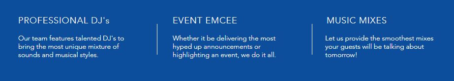 We want to make your event a success with music your guests won't soon forget. We are diverse team of professional Event DJ's who bring a unique mixture of sounds and musical styles tailored to fit the tastes of you and your guests. You can trust s3 to guarantee the entertainment at your event runs smoothly. Check out the different packages we offer.